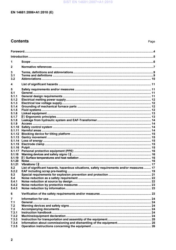 Tables Table 1 — Significant hazards, hazardous situations, safety requirements and/or measures . 18 Table A.1 — Example of declared dual-number noise emission values . 32 Table B.1 — EAF with AC technology . 33 Table B.2 — EAF with DC technology . 33 Table B.3 — Auxiliaries . 33
