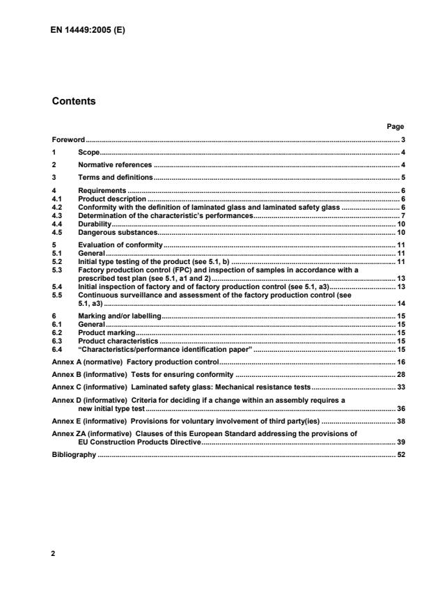 Page Foreword.3 1 Scope.4 2 Normative references.4 3 Terms and definitions.5 4 Requirements.6 4.1 Product description.6 4.2 Conformity with the definition of laminated glass and laminated safety glass.6 4.3 Determination of the characteristic’s performances.7 4.4 Durability.10 4.5 Dangerous substances.10 5 Evaluation of conformity.11 5.1 General.11 5.2 Initial type testing of the product (see 5.1, b).11 5.3 Factory production control (FPC) and inspection of samples in accordance with a prescribed test plan (see 5.1, a1 and 2).13 5.4 Initial inspection of factory and of factory production control (see 5.1, a3).13 5.5 Continuous surveillance and assessment of the factory production control (see 5.1, a3).14 6 Marking and/or labelling.15 6.1 General.15 6.2 Product marking.15 6.3 Product characteristics.15 6.4 “Characteristics/performance identification paper”.15 Annex A (normative)