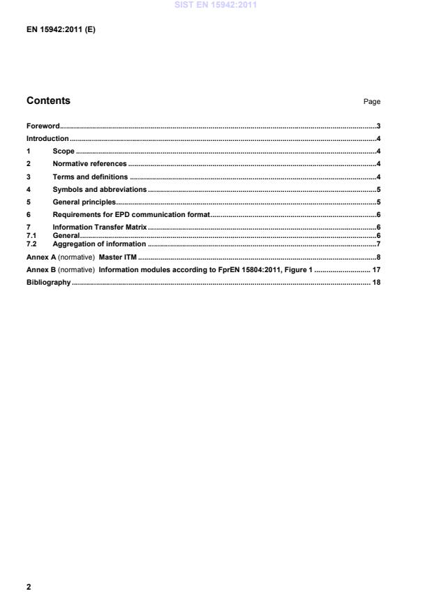 Information Transfer Matrix LCA Life Cycle Assessment LCIA Life Cycle Impact Assessment PCR Product Category Rules 5 General principles To present environmental information in a structured and consistent way and in a common format, a generic template is used. The generic template is used for information transfer. The generic template is called an Information Transfer Matrix (ITM). The ITM: does not preclude the fact that an EPD can have an individual and unique format; is the standardized part of EPD communication according to FprEN 15804; a statement whether the ITM has been independently verified shall be made. The ITM addresses the following types of information according to FprEN 15804: general information; declaration of environmental parameters derived from LCA: parameters describing environmental impacts; parameters describing resource input; additional environmental information describing different waste categories and output flows; scenarios and technical information; additional information on emissions to indoor air, soil and water during the use stage. NOTE For all quantified data, the corresponding scenario is specified in accordance with FprEN 15804. SIST EN 15942:2011