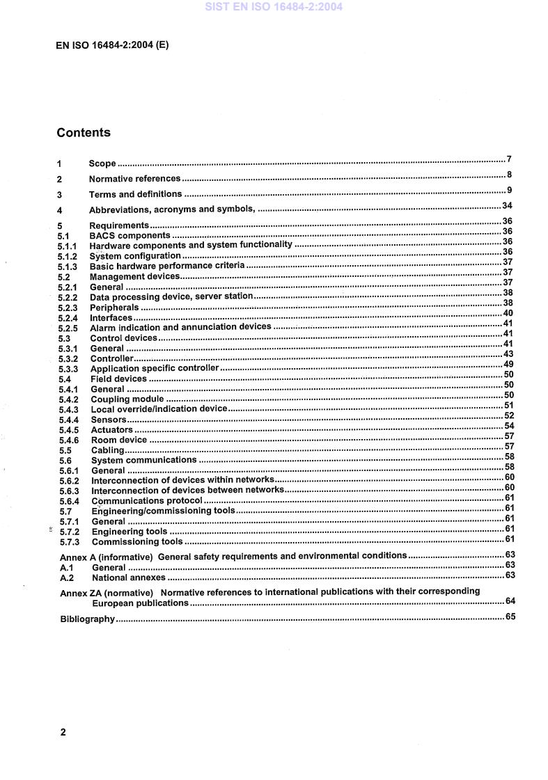 EN ISO 16484-2:2004 is a standard published by the European Committee for Standardization (CEN). Its full title is "Building automation and control systems (BACS) - Part 2: Hardware (ISO 16484-2:2004)". This standard covers: ISO 16484-2:2004 specifies the requirements for the hardware to perform the tasks within a building automation and control system (BACS). It provides the terms, definitions and abbreviations for the understanding of ISO 16484-2 and ISO 16484-3. ISO 16484-2:2004 relates only to physical items/devices, i.e. devices for management functions, operator stations and other human system interface devices; controllers, automation stations and application specific controllers; field devices and their interfaces; cabling and interconnection of devices; engineering and commissioning tools. ISO 16484-2:2004 shows a generic system model to which all different types of BACS and their interconnections (BACS network) can fit. A graphical concept of the BACS network in terms of LAN topology will be provided in ISO 16484-5.