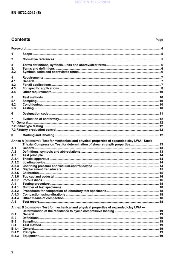 Test for mechanical and physical properties of expanded clay LWA –Static Triaxial Compression Test for determination of shear strength properties . 13A.1General . 13A.2Definitions, symbols and abbreviations . 13A.3Test principle . 14A.3.1Triaxial apparatus . 14A.3.2Loading device . 14A.3.3Confining pressure and vacuum-control device . 14A.3.4Displacement transducers . 15A.3.5Calibration . 15A.3.6Top cap and pedestal . 16A.3.7Porous discs . 16A.4Testing procedure. 18A.4.1Number of test specimens . 18A.4.2Procedures for compaction of laboratory test specimens . 18A.4.3Compaction using vibrations . 18A.4.4Other means of compaction . 18A.5Test report . 18Annex B (normative)