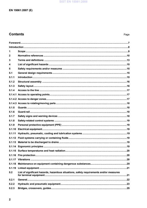 EN ISO 14122-1, Safety of machinery - Permanent means of access to machinery - Part 1: Choice of fixed means of access between two levels (ISO 14122-1:2001) EN ISO 14122-2, Safety of machinery - Permanent means of access to machinery - Part 2: Working platforms and walkways (ISO 14122-2:2001) EN ISO 14122-3, Safety of machinery - Permanent means of access to machinery - Part 3: Stairs, stepladders and guard-rails (ISO 14122-3:2001) EN ISO 14122-4, Safety of machinery - Permanent means of access to machinery - Part 4: Fixed ladders (ISO 14122-4:2004) EN ISO 15004-1, Ophthalmic instruments - Fundamental requirements and test methods - Part 1: General requirements applicable to all ophthalmic instruments (ISO 15004-1:2006) ISO 3864-1, Graphical symbols — Safety colours and safety signs — Part 1: Design principles for safety signs in workplaces and public areas ISO 7000, Graphical symbols for use on equipment — Index and synopsis IEC 61496-2, Safety of machinery — Electro-sensitive protective equipment — Part 2: Particular requirements for equipment using active opto-electronic protective devices (AOPDs) CLC/R 044-001:1999, Safety of machinery — Guidance and recommendations for the avoidance of hazards due to static electricity 3 Terms and definitions For the purposes of this document, the terms and definitions given in EN ISO 12100-1:2003 and the following apply. NOTE Definitions used in EN and ISO standards referred to in this document are also valid for this document. 3.1 strip processing line interconnection of equipment described in 3.2 and 3.3 in which several machines or stages are linked 3.2 terminal equipment equipment for moving, guiding, connecting, dividing and trimming the metal strip, coil handling equipment and related auxiliary equipment like hydraulic and pneumatic equipment 3.3 processing equipment equipment for treating the surface and/or modifying the product properties 3.4 plating section various number of electroplating cells in the process section of an electro processing line NOTE E. g., see Figure D.7. SIST EN 15061:2008
