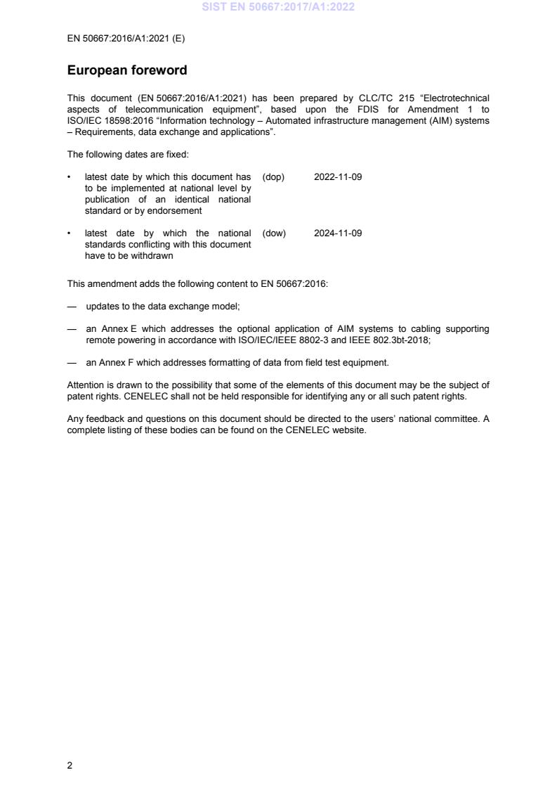 EN 50667:2016/A1:2021 specifies requirements, recommendations and a data-exchange model for Automated Infrastructure Management (AIM) systems used to document, monitor and manage telecommunications cabling and related infrastructure. This CENELEC amendment updates the original EN 50667:2016 and adds support for remote powering / Power over Ethernet (PoE), refinements to the data exchange model, and guidance for importing test data from field equipment.