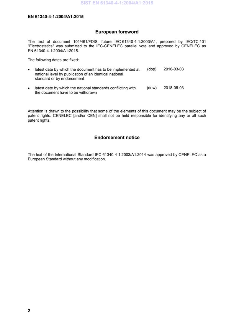 This amendment A1 modifies the European Standard EN 61340-4-1:2004; it was approved by CENELEC on 2015-06-03. CENELEC