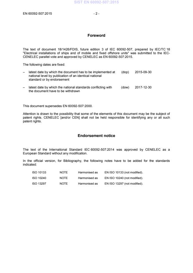 This document supersedes EN 60092-507:2000. Attention is drawn to the possibility that some of the elements of this document may be the subject of patent rights. CENELEC [and/or CEN] shall not be held responsible for identifying any or all such patent rights. Endorsement notice The text of the International Standard IEC 60092-507:2014 was approved by CENELEC as a European Standard without any modification. In the official version, for Bibliography, the following notes have to be added for the standards indicated: ISO 10133 NOTE Harmonised as EN ISO 10133 (not modified). ISO 10240 NOTE Harmonised as EN ISO 10240 (not modified). ISO 13297 NOTE Harmonised as EN ISO 13297 (not modified).