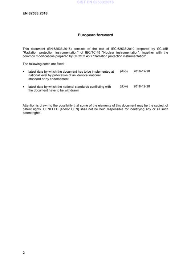 EN 62533:2016 (CLC adoption of IEC 62533) is a European standard for radiation protection instrumentation, specifically highly sensitive hand-held instruments for photon detection of radioactive material. It defines performance requirements, test methods and operating conditions for portable detectors that locate and detect slight variations in photon background caused by illicit trafficking or inadvertent movement of radioactive sources. These instruments can scan large volumes (vehicles, containers), operate in fixed or temporarily unattended modes, and also indicate ambient dose equivalent rate from photon radiation.