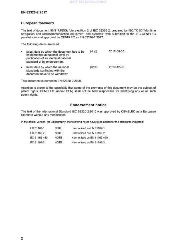 IEC 61162-1 NOTE Harmonized as EN 61162-1. IEC 61162-2 NOTE Harmonized as EN 61162-2. IEC 61162-460 NOTE Harmonized as EN 61162-460. IEC 61993-2 NOTE Harmonized as EN 61993-2. SIST EN 62320-2:2017
