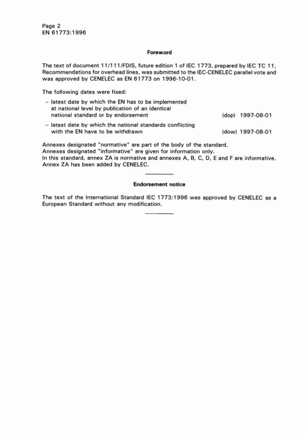 - Normative references cited within EN 61773 include IEC 826 and the International Electrotechnical Vocabulary (IEV) chapters relevant to overhead lines.