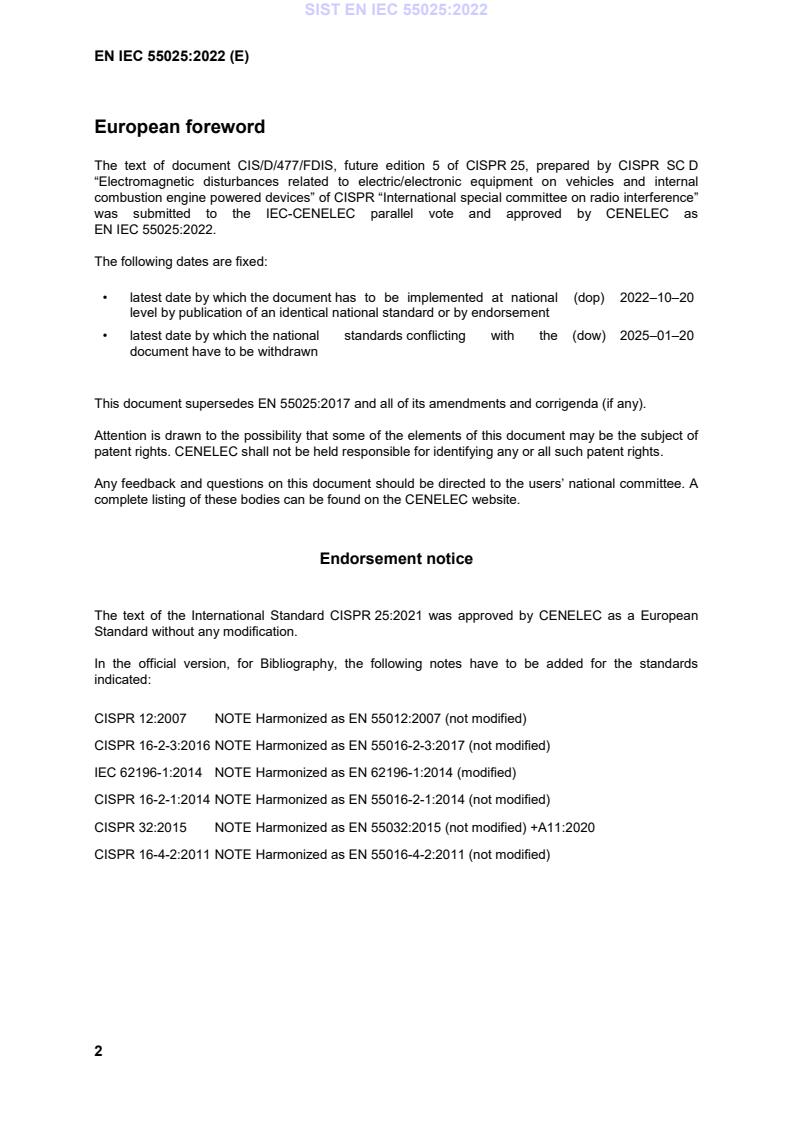 EN IEC 55025 references and aligns with other EMC and vehicle standards such as CISPR 16‑series, CISPR 12, EN 55016, IEC 61851‑1 and vehicle test standards like ISO 7637‑3. Use these cross‑references when planning comprehensive EMC test programs.