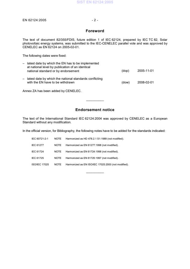2008-02-01 Annex ZA has been added by CENELEC. __________ Endorsement notice The text of the International Standard IEC 62124:2004 was approved by CENELEC as a European Standard without any modification. In the official version, for Bibliography, the following notes have to be added for the standards indicated: