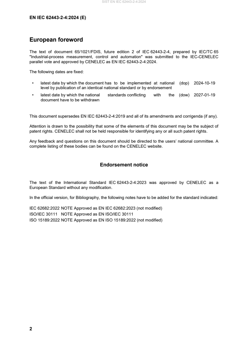 - EN IEC 62443-2-4:2024 is the CENELEC-adopted European edition of the IEC document.