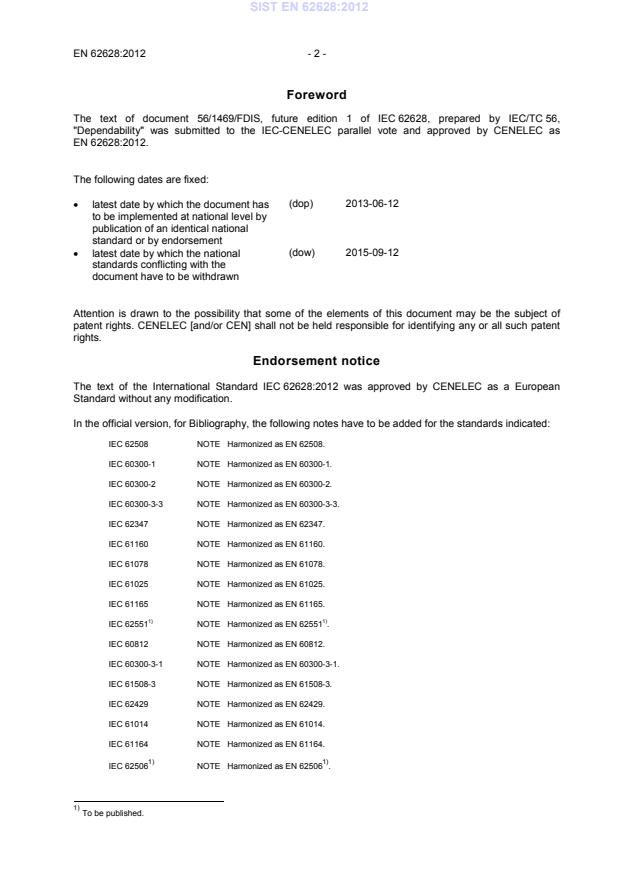 SIST EN 62628 references and complements other IEC/CENELEC standards useful for dependability engineering, for example: