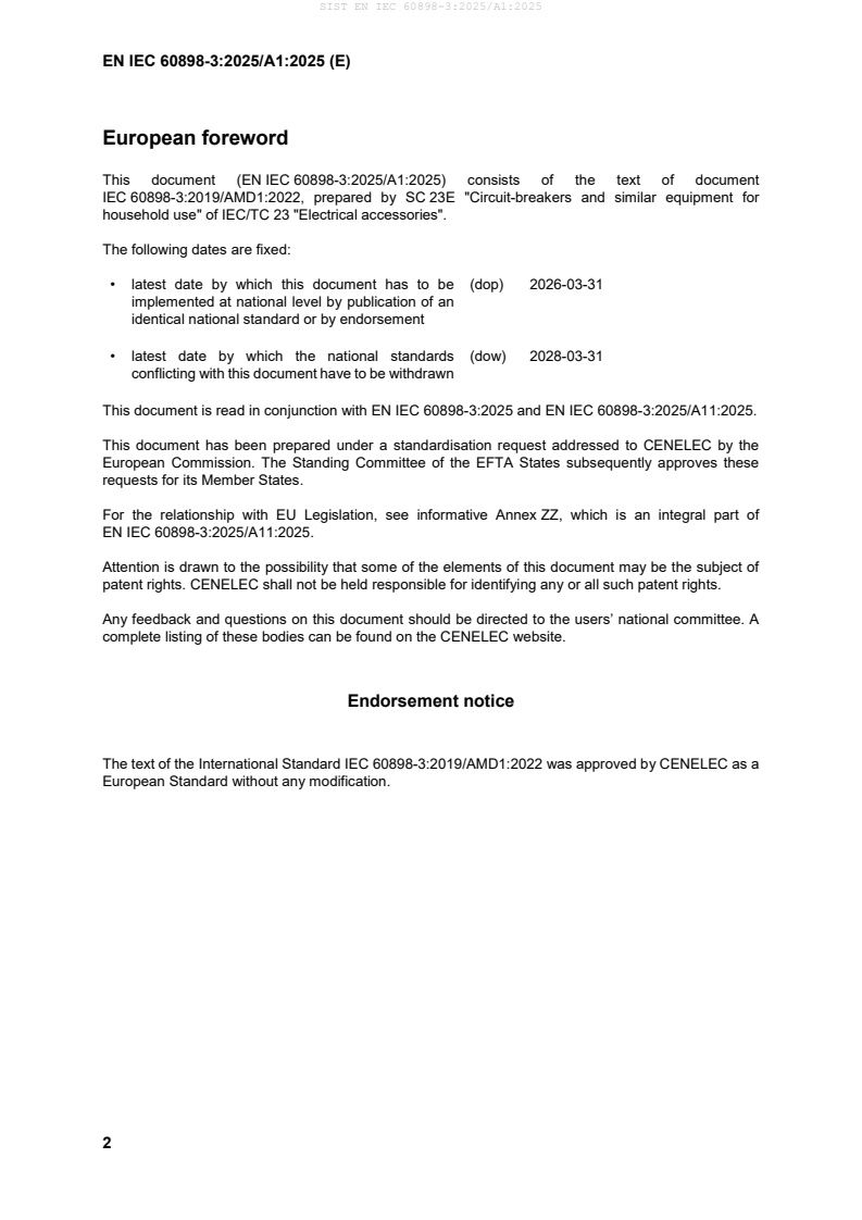 This amendment A1 modifies the European Standard EN IEC 60898-3:2025; it was approved by CENELEC on 2025-02-03. CENELEC