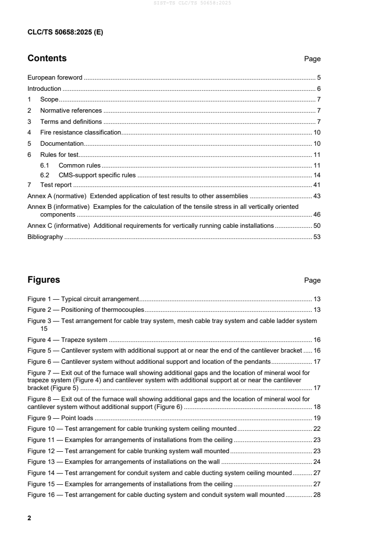 Keywords: CLC/TS 50658:2025, cable management systems, CMS, fire resistance, intrinsic fire‑resistant cables, Pcms classification, cable tray testing, EN 1366‑11, fire‑resistant cable support.