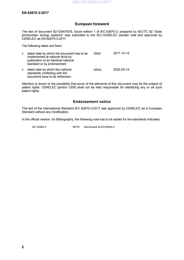 EN 62670-3:2017 (identical to IEC 62670-3:2017) specifies measurement procedures and instrumentation for determining the performance and power rating of concentrator photovoltaic (CPV) devices. The standard defines how to measure CPV performance at the Concentrator Standard Operating Conditions (CSOC) and Concentrator Standard Test Conditions (CSTC) (see IEC 62670-1 for definitions), and how to translate measured data into rated output (power rating).