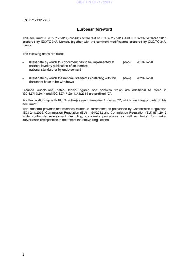 EN 62717:2017 is associated with the following European legislation: EU Directives/Regulations: 1194/2012, 2009/125/EC, 2010/30/EU, 244/2009, 874/2012; Standardization Mandates: M/495. When a standard is cited in the Official Journal of the European Union, products manufactured in conformity with it benefit from a presumption of conformity with the essential requirements of the corresponding EU directive or regulation.