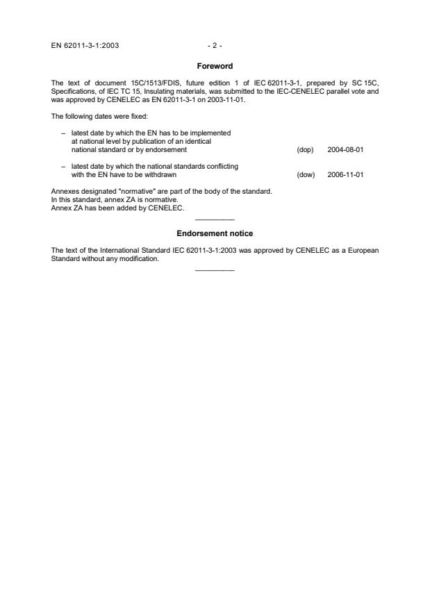 The text of document 15C/1513/FDIS, future edition 1 of IEC 62011-3-1, prepared by SC 15C, Specifications, of IEC TC 15, Insulating materials, was submitted to the IEC-CENELEC parallel vote and was approved by CENELEC as EN 62011-3-1 on 2003-11-01.
