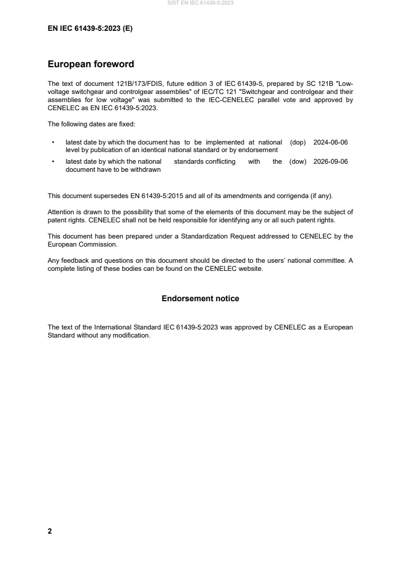 EN IEC 61439-5:2023 (IEC 61439-5:2023) specifies requirements for low-voltage switchgear and controlgear assemblies used for power distribution in public networks. It defines PENDAs (public electricity network distribution assemblies) intended for stationary distribution in three-phase AC systems up to 1 000 V and DC systems up to 1 500 V. This third edition (2023) replaces the 2014 edition and is a technical revision approved by CENELEC.