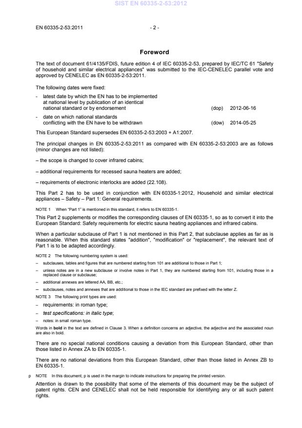 EN 60335-2-53:2011 is a standard published by CLC. Its full title is "Household and similar electrical appliances - Safety - Part 2-53: Particular requirements for sauna heating appliances and infrared cabins". This standard covers: IEC 60335-2-53:2011 deals with the safety of electric sauna heating appliances and infrared emitting units having a rated power input not exceeding 20 kW, their rated voltage being not more than 250 V for single-phase appliances and 480 V for other appliances. The appliances covered by this standard are intended for use in the home and in public saunas located in blocks of flats, hotels and similar locations. This standard also deals with the safety of electric sauna heating appliances provided with a humidifier unit, their rated voltage being not more than 250 V for single-phase appliances and 480 V for other appliances. The room air is humidified by evaporating or atomising water. This fourth edition cancels and replaces the third edition published in 2002 and its Amendment 1 (2007). It constitutes a technical revision. The principal changes in this edition as compared with the third edition of IEC 60335-2-53 are as follows: - the scope is changed to cover infrared cabins; - additional requirements for recessed sauna heaters are added; - requirements of electronic interlocks are added (22.108). The attention of National Committees is drawn to the fact that equipment organizations may need a transitional period following publication of a new, amended or revised IEC publication in which to make products in accordance with the new requirements and to equip themselves for conducting new or revised tests. It is the recommendation of the committee that the content of this publication be adopted for implementation nationally not earlier than 12 months or later than 36 months from the date of publication. This publication is to be read in conjunction with IEC 60335-1:2010.