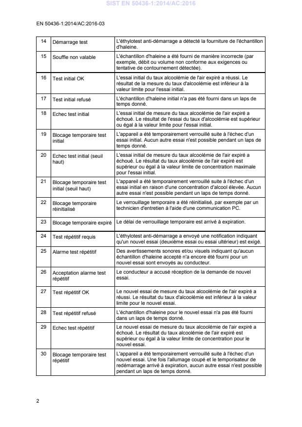 27 Test répétitif OK Le nouvel essai de mesure du taux alcoolémie de l'air expiré a réussi. Le résultat du taux d'alcoolémie est inférieur à la valeur limite pour le nouvel essai. 28 Test répétitif refusé L'échantillon d'haleine pour le nouvel essai n'a pas été fourni dans un laps de temps donné. 29 Echec test répétitif Le nouvel essai de mesure du taux alcoolémie de l'air expiré a échoué. Le résultat du taux alcoolémie de l'air expiré est supérieur ou égal à la valeur limite de concentration pour le nouvel essai. 30 Blocage temporaire test répétitif L'appareil a été temporairement verrouillé suite à l'échec d'un nouvel essai. Une fois l'allumage coupé et le temporisateur de redémarrage arrivé à expiration, aucun autre essai n'est possible pendant un laps de temps donné. SIST EN 50436-1:2014/AC:2016