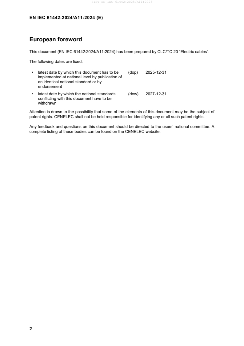This amendment A11 modifies the European Standard EN IEC 61442:2024; it was approved by CENELEC on 2024-12-09. CENELEC