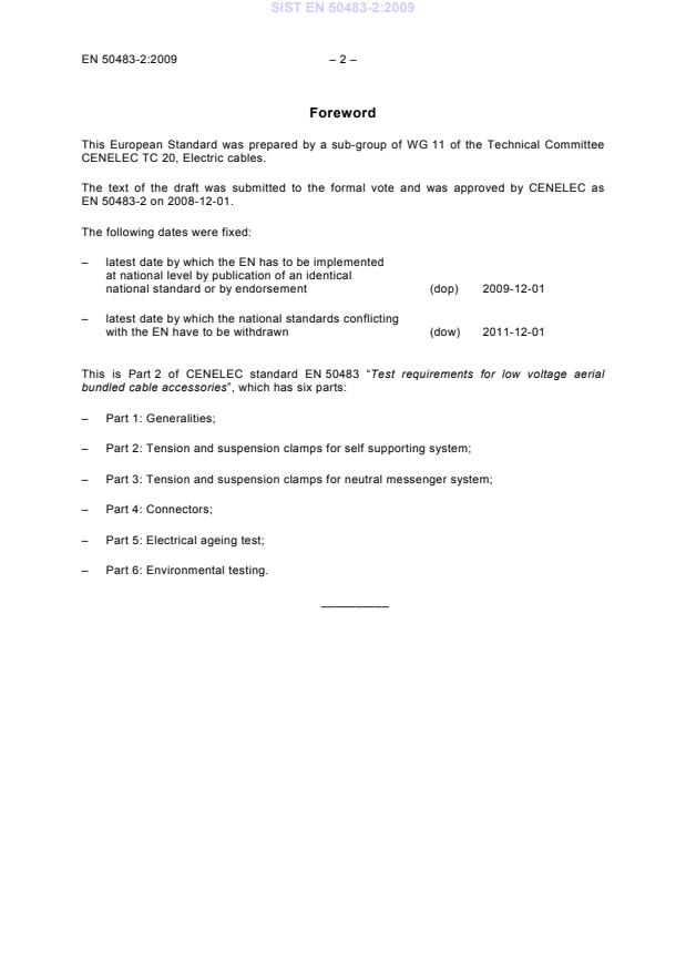 2011-12-01 This is Part 2 of CENELEC standard EN 50483 “Test requirements for low voltage aerial bundled cable accessories”, which has six parts: – Part 1: Generalities; – Part 2: Tension and suspension clamps for self supporting system; – Part 3: Tension and suspension clamps for neutral messenger system; – Part 4: Connectors; – Part 5: Electrical ageing test; – Part 6: Environmental testing. __________ SIST EN 50483-2:2009