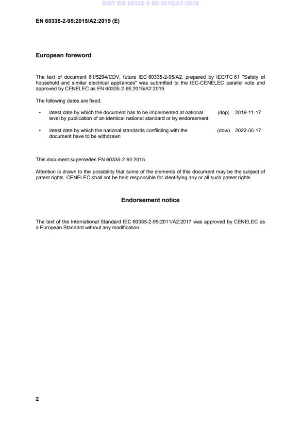 This amendment A2 modifies the European Standard EN 60335-2-95:2015; it was approved by CENELEC on 2017-11-09. CENELEC