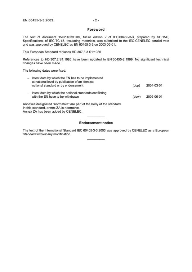 The text of document 15C/1463/FDIS, future edition 2 of IEC 60455-3-3, prepared by SC 15C, Specifications, of IEC TC 15, Insulating materials, was submitted to the IEC-CENELEC parallel vote and was approved by CENELEC as EN 60455-3-3 on 2003-06-01.