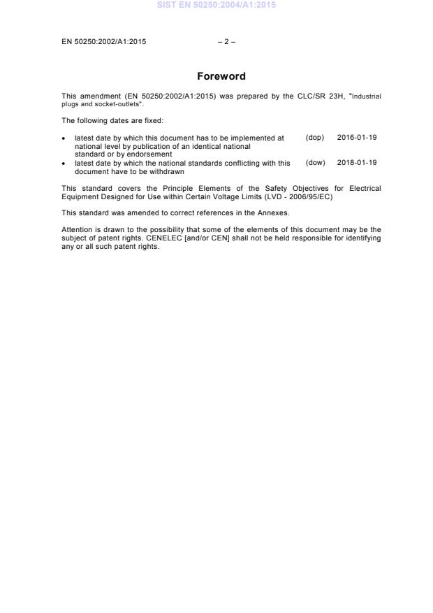 This amendment is primarily administrative and editorial in nature but is important for correct referencing and consistent national implementation. Keywords: EN 50250:2002/A1:2015, conversion adaptors, industrial plugs and sockets, industrial use, CENELEC, EN 50525-2-11, Low Voltage Directive, safety, national annexes.