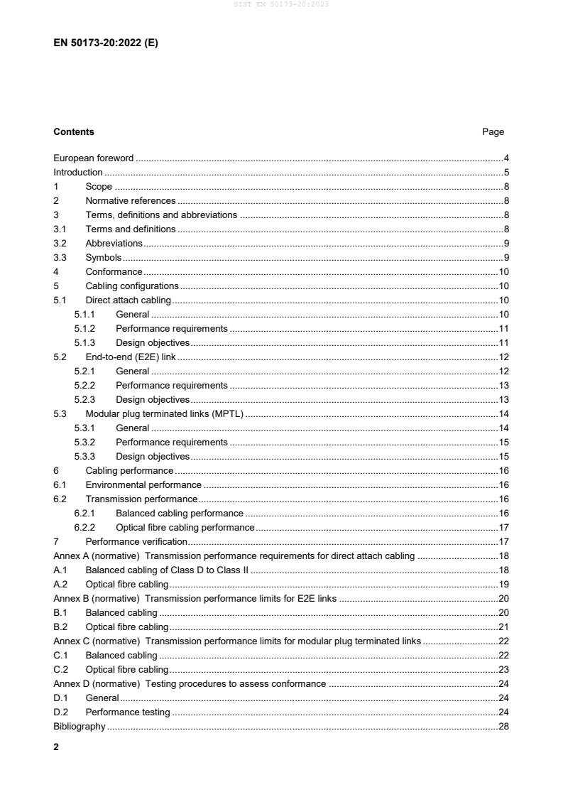 Keywords: EN 50173-20:2022, alternative cabling configurations, direct attach cabling, E2E link, MPTL, balanced cabling, optical fibre, transmission performance, EN 50697, EN 50173 series.