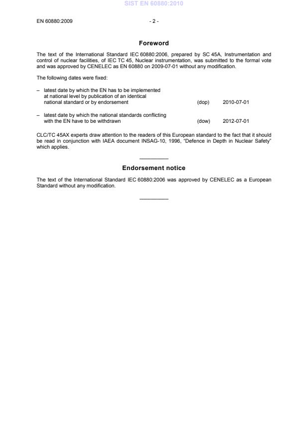 EN 60880:2009 (CLC), identical to IEC 60880:2006, specifies software requirements for computer-based Instrumentation & Control (I&C) systems in nuclear power plants that perform category A safety functions (highest safety importance as defined by IEC 61226). The standard covers the full software safety life‑cycle to achieve highly reliable, safety‑critical software and to support defence‑in‑depth in nuclear safety. It applies to requirements specification, design, implementation, verification, validation, installation, operation and maintenance of safety software.