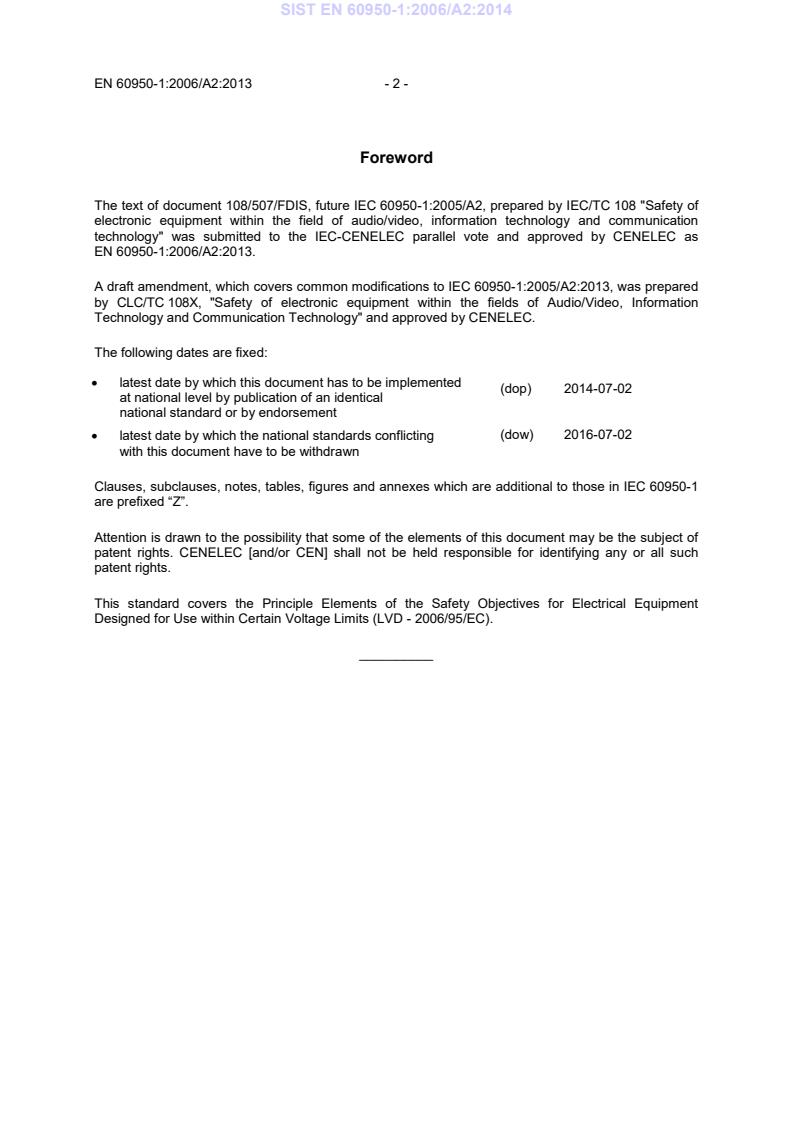 This amendment A2 modifies the European Standard EN 60950-1:2006; it was approved by CENELEC on 2013-