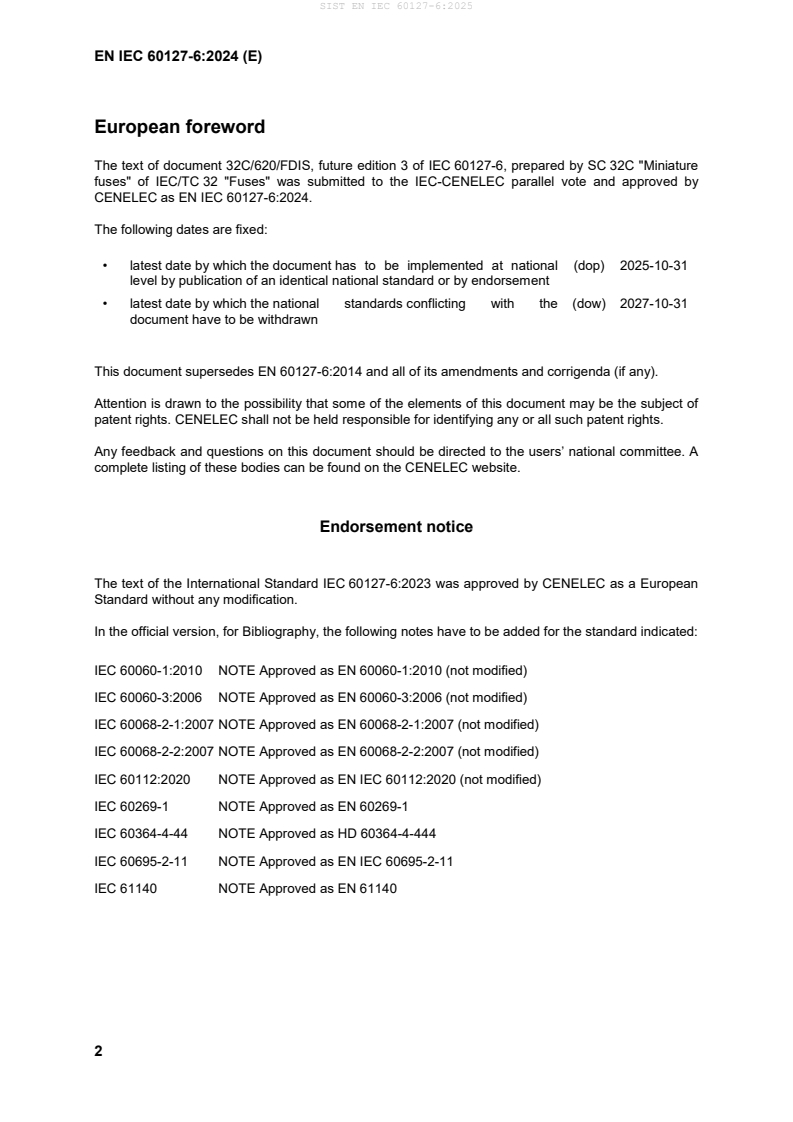 Keywords: EN IEC 60127-6:2024, miniature fuses, fuse-holders, fuse-links, electrical safety, clearances creepage, thermal requirements, insulation, conformity testing.