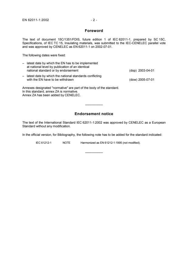 EN 62011-1:2002 is a standard published by CLC. Its full title is "Insulating materials - Industrial, rigid, moulded, laminated tubes and rods of rectangular and hexagonal cross-section based on thermosetting resins for electrical purposes - Part 1: Definitions, designations and general requirements". This standard covers: Contains the definitions and designations related to, and the general requirements to be fulfilled by, industrial, rigid, moulded, laminated tubes of rectangular cross-section and rods of rectangular and hexagonal cross-section. The moulded sections are manufactured using either phenolic or epoxy resins as the binder and using the following reinforcements: cellulosic paper, cotton cloth or glass cloth. This standard covers both rods and tubes of natural colour and those containing colouring matter or other additives. Materials which conform to this standard meet established levels of performance. However, the selection of a material by a user for a specific application should be based on the actual requirements necessary for adequate performance in that application and not based on this standard alone.