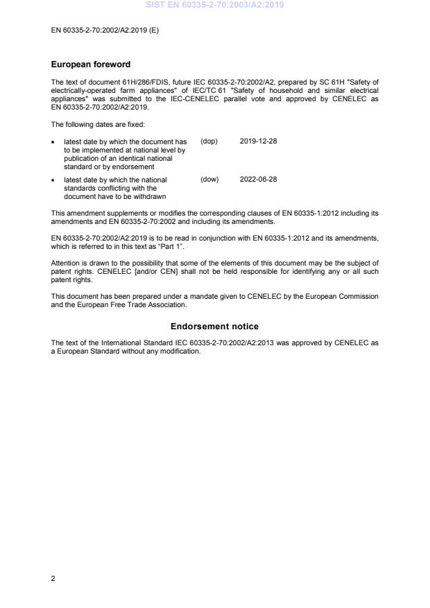 EN 60335-2-70:2002/A2:2019 is the CENELEC/CLC amendment to the European safety standard for household and similar electrical appliances - particular requirements for milking machines. It implements Amendment 2 (A2) to EN 60335-2-70 and aligns the European text with IEC 60335-2-70:2002/A2:2013. This amendment is to be read together with EN 60335-1:2012 (Part 1) and updates marking, instructions and normative references specific to electrically operated milking equipment.