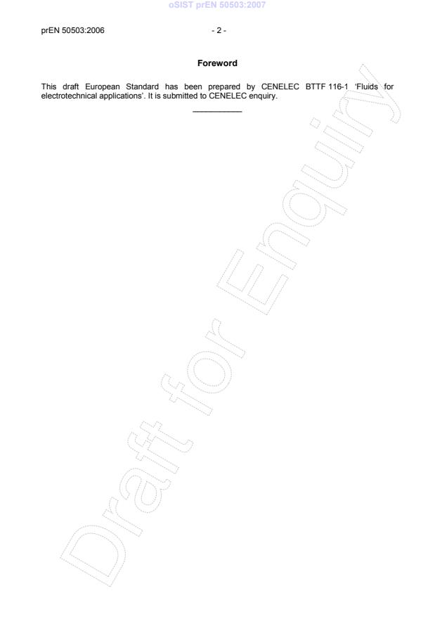prEN 50503 is a draft published by CLC. Its full title is "Fluids for electrotechnical applications - Standard for the inventory control, management, decontamination and/or disposal of electrical equipment and insulating liquids containing PCBs". This standard covers: D145/093: CLC/BTTF 116-1 converted into CLC/TC 10 * D134/030 (taken by majority): BTTF 116-1 to review GB comments in order to either revise draft prepared for vote, or stop project * D135/C151: NWI as CLC/prTR approved (pr=22541)