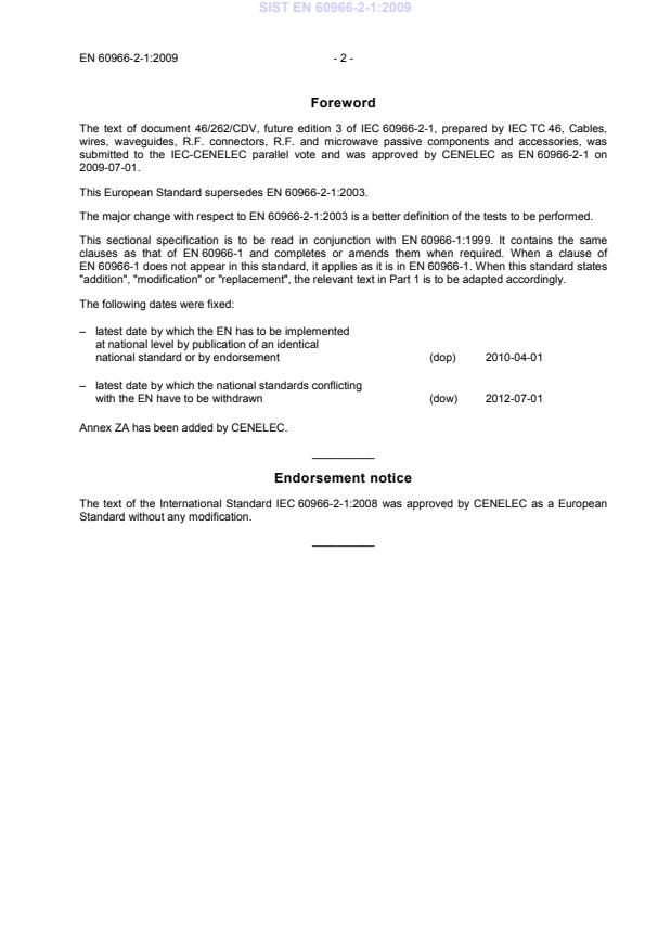 EN 60966-2-1:2009 (CLC adoption of IEC 60966-2-1:2008) is a sectional specification for flexible coaxial cable assemblies operating in the transverse electromagnetic (TEM) mode. It defines uniform requirements and test procedures for finished RF cable assemblies - comprised of flexible coaxial cables and coaxial connectors - covering electrical, mechanical and climatic properties. The 2009 edition supersedes the 2003 version, with the major change being a clearer, better-defined set of tests to be performed. This standard is intended to be read together with EN/IEC 60966-1 (Generic specification).