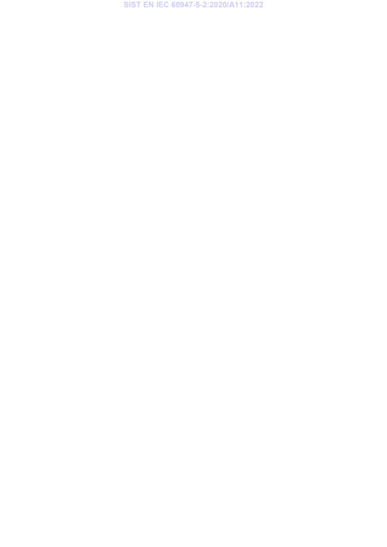 EN IEC 60947-5-2:2020/A11:2022 is a amendment published by CLC. Its full title is "Low-voltage switchgear and controlgear - Part 5-2: Control circuit devices and switching elements - Proximity switches". This standard covers: EN-IEC 60947-5-2 applies to inductive and capacitive proximity switches that sense the presence of metallic and/or non-metallic objects, ultrasonic proximity switches that sense the presence of sound reflecting objects, photoelectric proximity switches that sense the presence of objects and non-mechanical magnetic proximity switches that sense the presence of objects with a magnetic field. Products covered by the scope of this document are not subjected to defined behaviours under fault conditions. Proximity switches with defined behaviour are covered by IEC 60947-5-3 and have to fulfil additional requirements. These proximity switches are self-contained, have semiconductor switching element(s) and are intended to be connected to circuits, the rated voltage of which does not exceed 250 V 50 Hz/60 Hz AC RMS or 300 V DC. Examples of typical applications for in-scope products: - factory automation and machinery industry; - logistic and packaging industry; - conveyor belts, lifts; - process industry; - power plants. Special applications (e.g. corrosive atmosphere) can cause additional requirements. This document is not intended to cover proximity switches with analogue outputs. The object of this document is to state for proximity switches: - definitions; - classification; - characteristics; - product information; - normal service, mounting and transport conditions; - constructional and performance requirements; - tests to verify rated characteristics. Products covered by the scope of this document are expected to be selected, installed, and maintained by skilled personnel only.