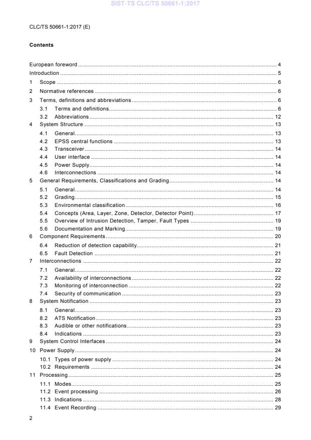 CLC/TS 50661-1:2017 is a technical specification published by CLC. Its full title is "Alarm systems - External perimeter security systems - Part 1: System requirements". This standard covers: This European Standard specifies the requirements for External and Perimeter security systems (EPSS)- installed externally using specific or non-specific wired interconnections or wire-free interconnections. These requirements are not intended to apply to security system, e.g. intruder alarms, visual surveillance system (VSS), access control systems installed in buildings. This standard specifies performance requirements for installed EPSS but does not include requirements for design, planning, installation, operation or maintenance. These requirements also apply to EPSS sharing means of detection, triggering, interconnection, control, communication and power supplies with other applications. The operation of a EPSS shall not be adversely influenced by other applications. Requirements are specified for EPSS components where the relevant environment is classified. This classification describes the environment in which a EPSS component may be expected to operate as designed. Requirements for two environmental classes are specified for EPSS components. When the requirements of these two environmental classes are inadequate, due to the extreme conditions experienced in certain geographic locations, special national conditions are also specified in Annex A. Interconnections and products used to combine both an I&HAS and EPSS systems, e.g. control and indicating equipment, should comply to both the IEC 62642 (EN 50131) and EPSS suite of standards. The failure of either system or a fault in either system should not be adversely affect the performance of the other.