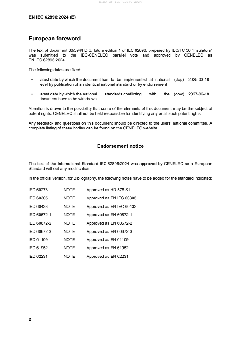 Ta dokument ne vključuje zahtev, ki obravnavajo izbiro izolatorjev za posebne obratovalne pogoje. Prva izdaja razveljavlja in nadomešča standard IEC TS 62896, objavljen leta 2015. Ta izdaja v primerjavi s prejšnjo vključuje naslednje pomembne tehnične spremembe: