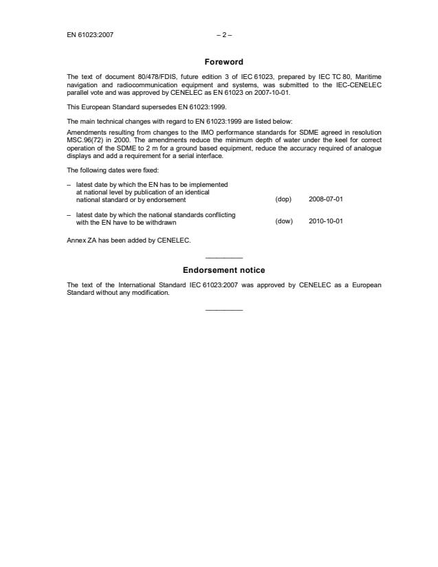 EN 61023:2007 (adoption of IEC 61023:2007) defines the performance requirements, test methods and required test results for marine Speed and Distance Measuring Equipment (SDME). It implements the SDME provisions of SOLAS Chapter V (Regulation 19) and is based on IMO Resolution MSC.96(72). The standard is associated with IEC 60945 and was adopted by CENELEC/CLC to harmonize European and international requirements for shipborne speed and distance sensors and displays.