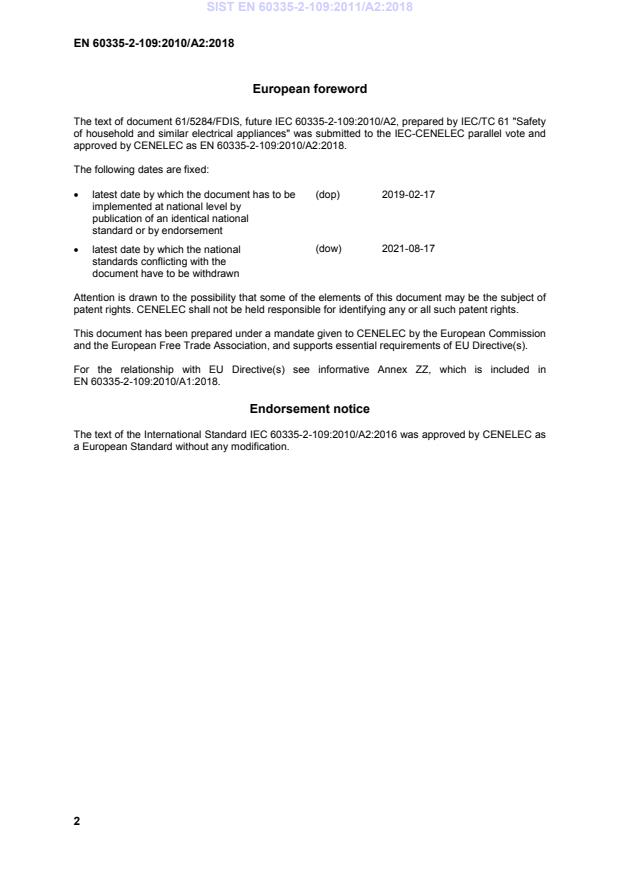 This amendment A2 modifies the European Standard EN 60335-2-109:2010; it was approved by CENELEC on 2018-05-02. CENELEC