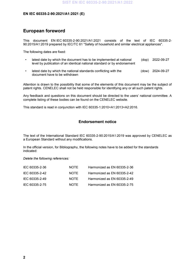 This amendment A1 modifies the European Standard EN IEC 60335-2-90:2021; it was approved by CENELEC on 2021-09-27. CENELEC