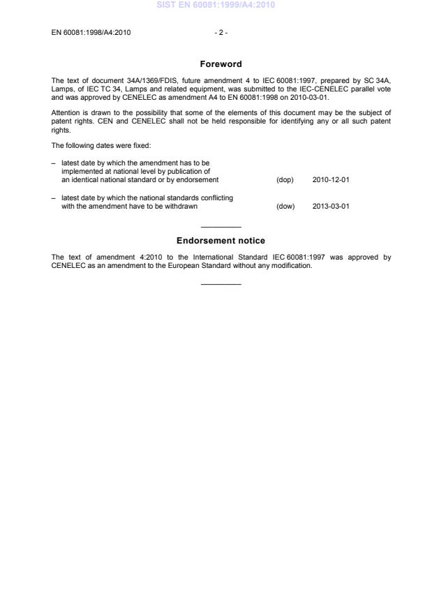 This amendment A4 modifies the European Standard EN 60081:1998; it was approved by CENELEC on