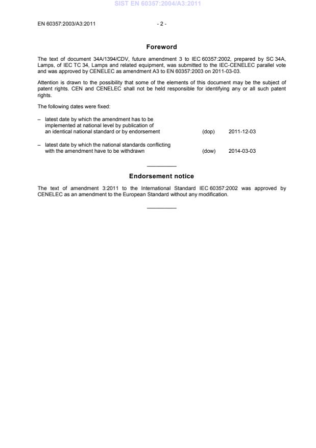 This amendment A3 modifies the European Standard EN 60357:2003; it was approved by CENELEC on