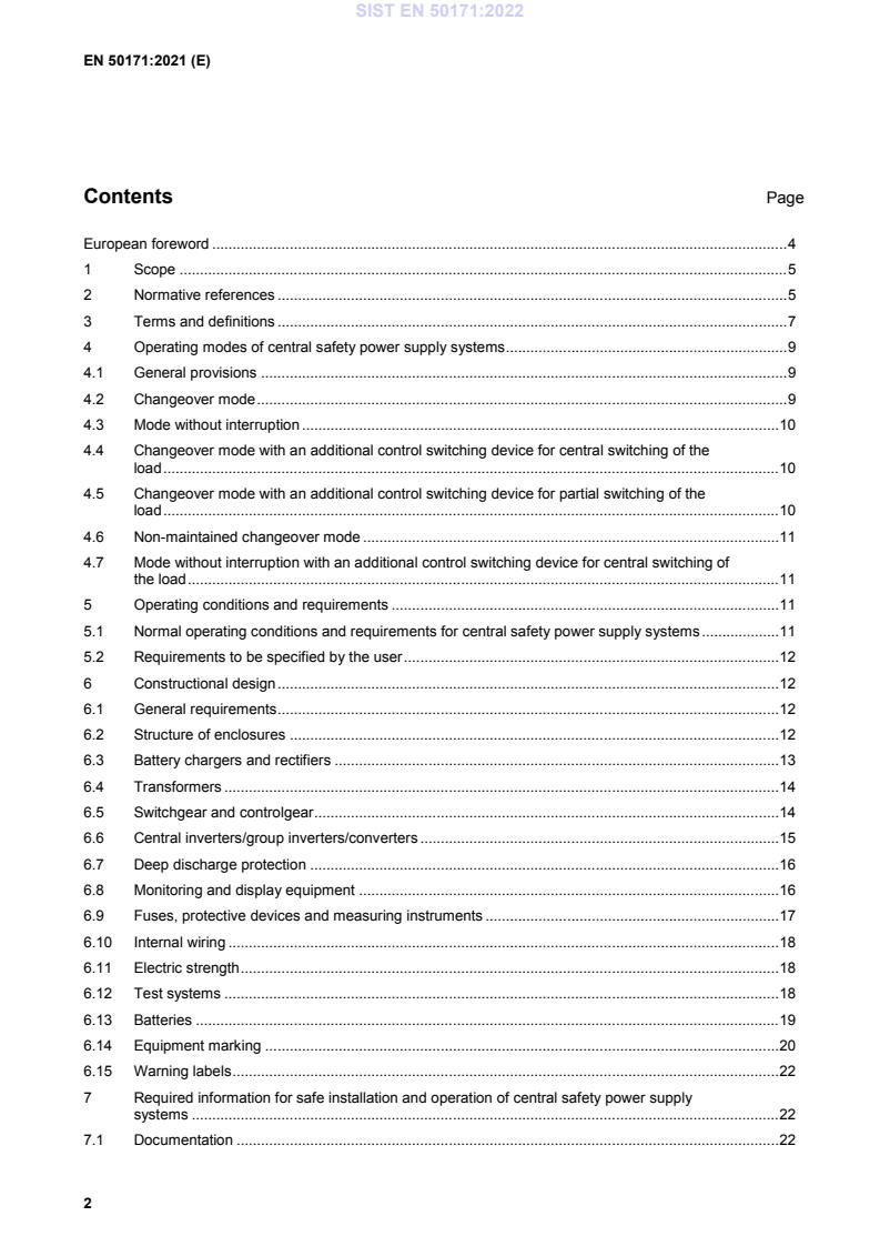Ta evropski standard določa splošne zahteve za centralne napajalne sisteme, ki zagotavljajo neodvisno oskrbo z energijo za nujno potrebno varnostno opremo. Ta standard zajema sisteme, ki so trajno priključeni na izmenično napajalno napetost do največ 1000 V in kot alternativni vir energije uporabljajo baterije.