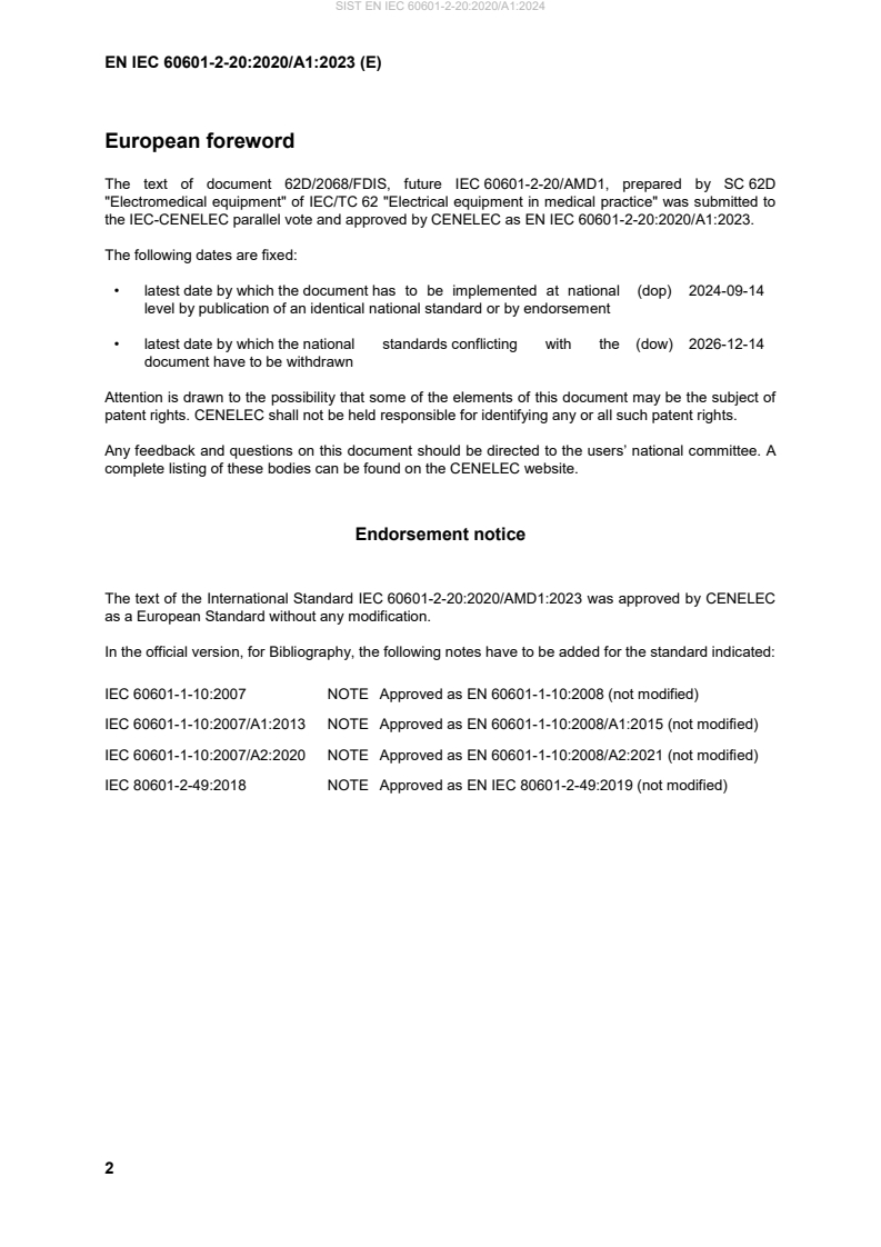 This amendment A1 modifies the European Standard EN IEC 60601-2-20:2020; it was approved by CENELEC on 2023-12-14. CENELEC