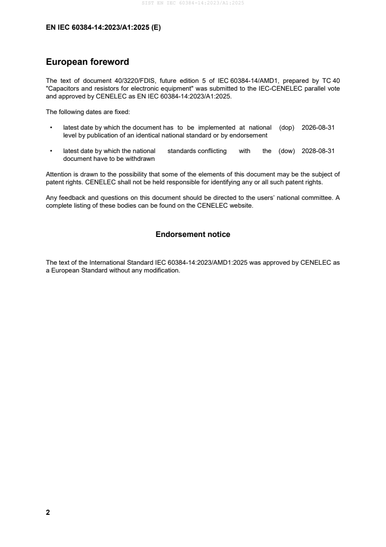 This amendment A1 modifies the European Standard EN IEC 60384-14:2023; it was approved by CENELEC on 2025-08-11. CENELEC