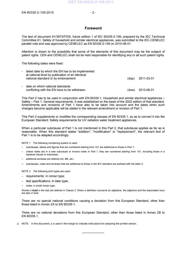 EN 60335-2-109:2010 is a standard published by CLC. Its full title is "Household and similar electrical appliances - Safety - Part 2-109: Particular requirements for UV radiation water treatment appliances". This standard covers: IEC 60335-2-109:2010 deals with the safety of UV radiation water treatment appliances for household and similar purposes, their rated voltage being not more than 250 V. Appliances not intended for normal household use but that nevertheless may be a source of danger to the public, such as appliances intended to be used by laymen in shops and in light industry and farms, are within the scope of this standard. The attention of National Committees is drawn to the fact that equipment manufacturers and testing organizations may need a transitional period following publication of a new, amended or revised IEC publication in which to make products in accordance with the new requirements and to equip themselves for conducting new or revised tests. It is the recommendation of the committee that the content of this publication be adopted for implementation nationally not earlier than 12 months or later than 36 months from the date of publication.