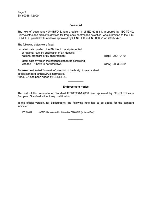 The text of document 49/448/FDIS, future edition 1 of IEC 60368-1, prepared by IEC TC 49, Piezoelectric and dielectric devices for frequency control and selection, was submitted to the IEC-CENELEC parallel vote and was approved by CENELEC as EN 60368-1 on 2000-04-01.